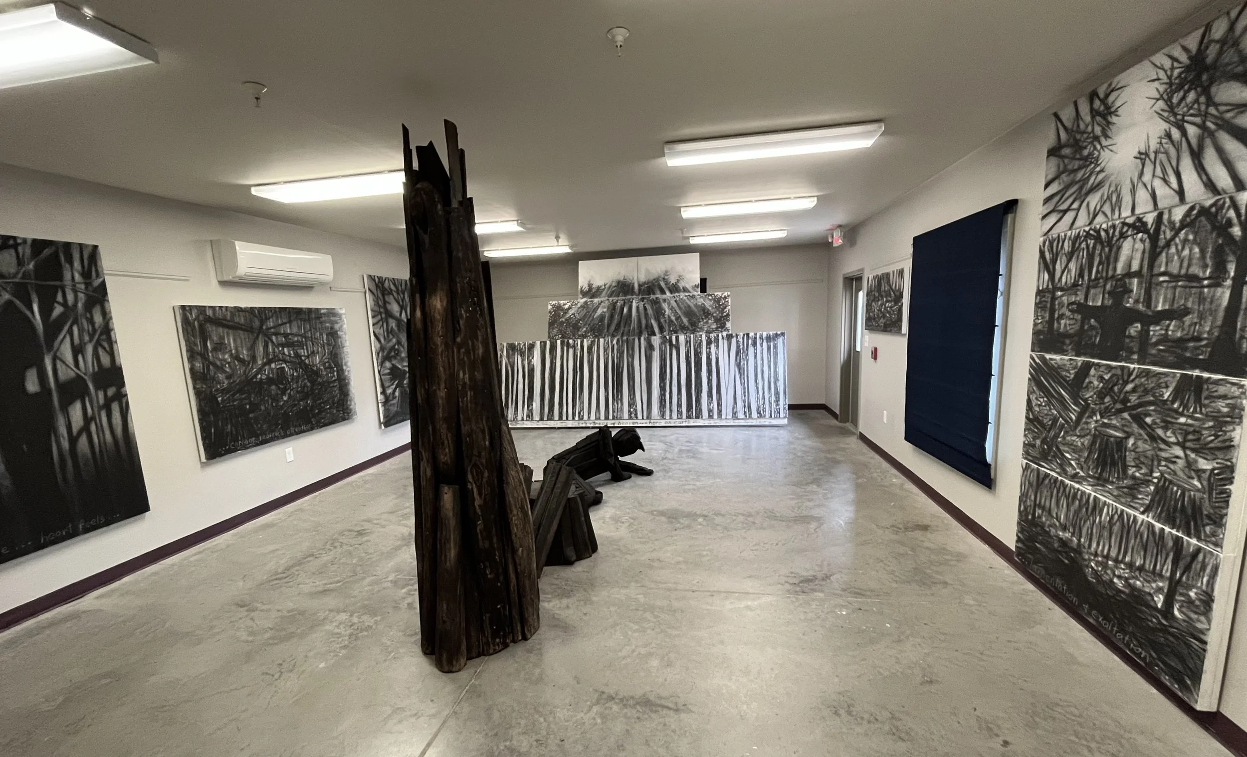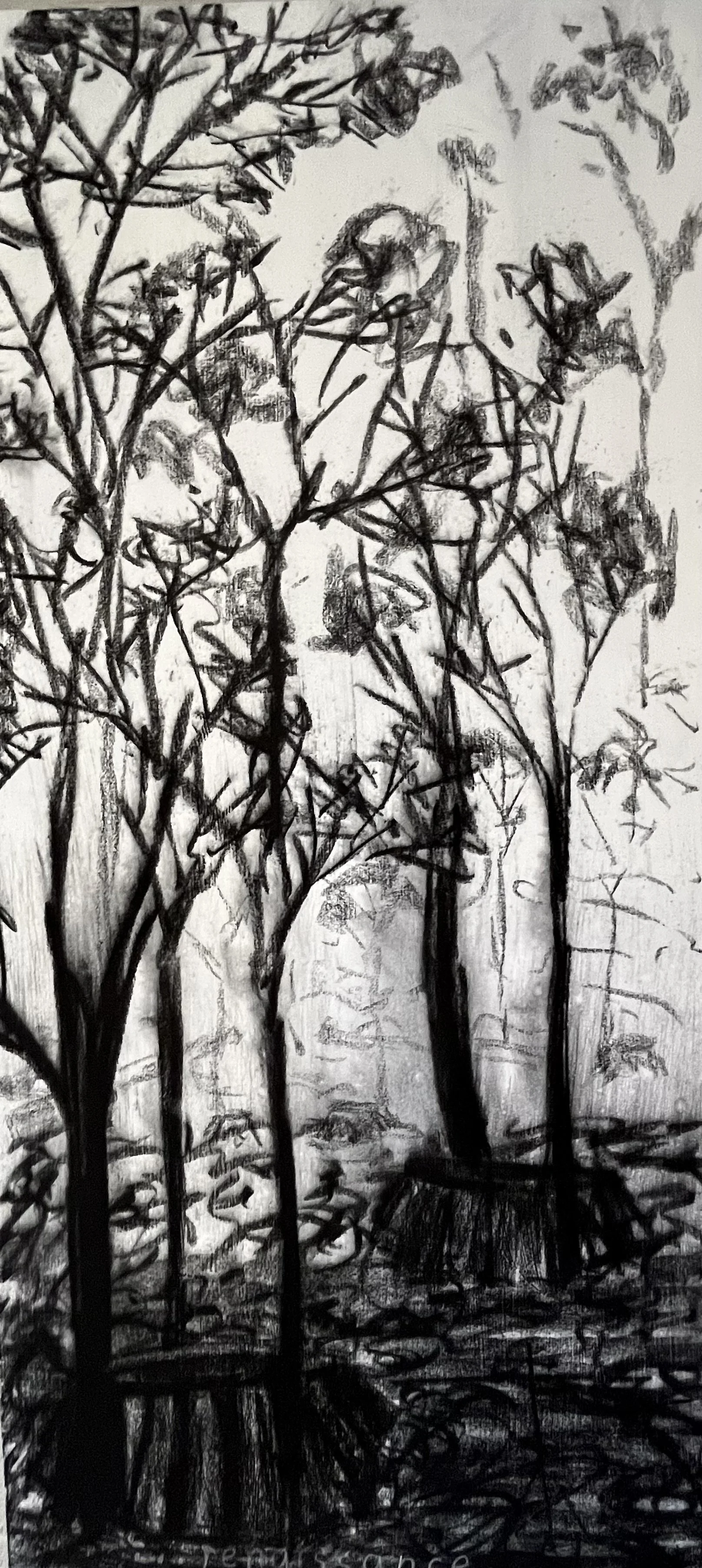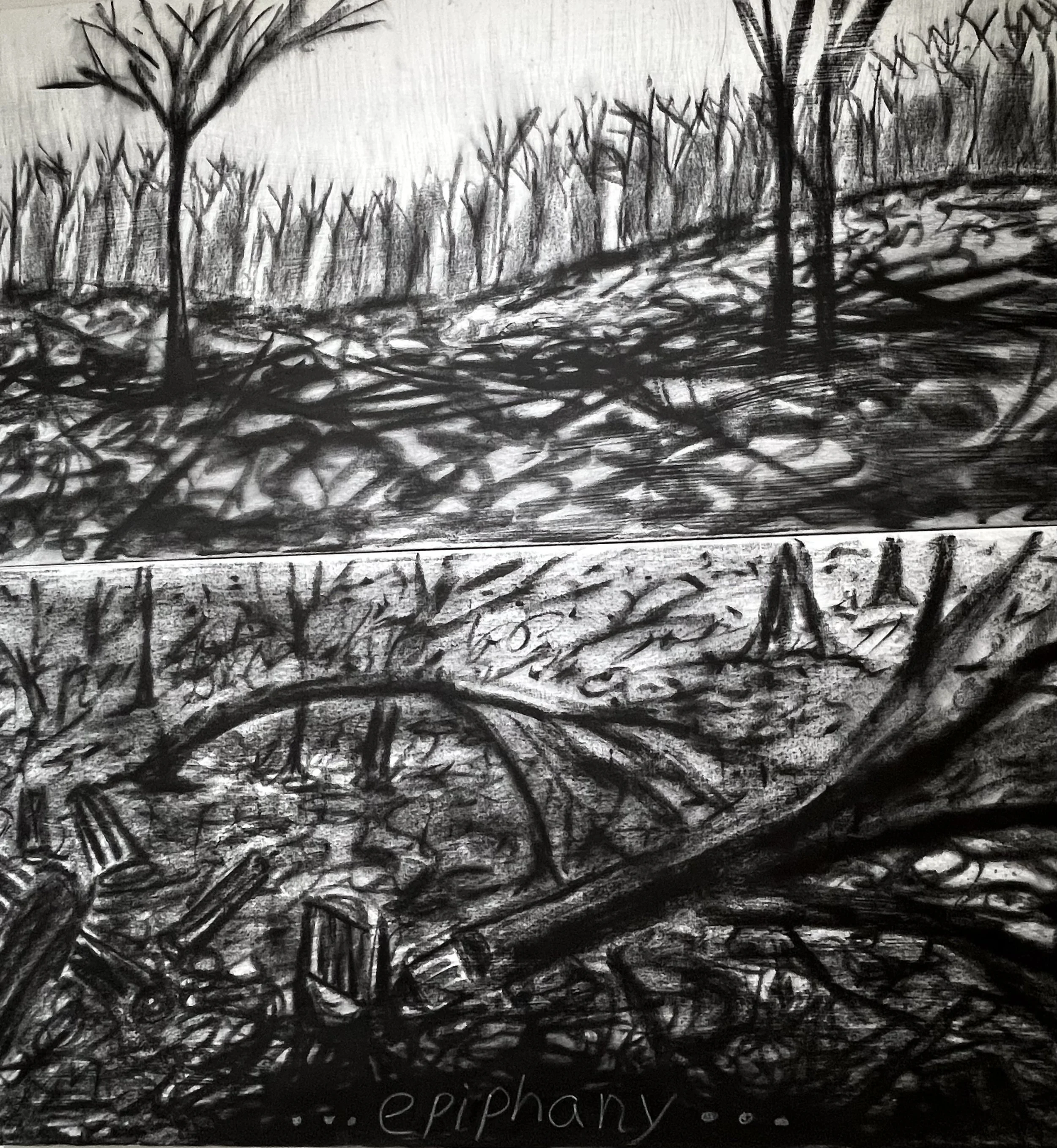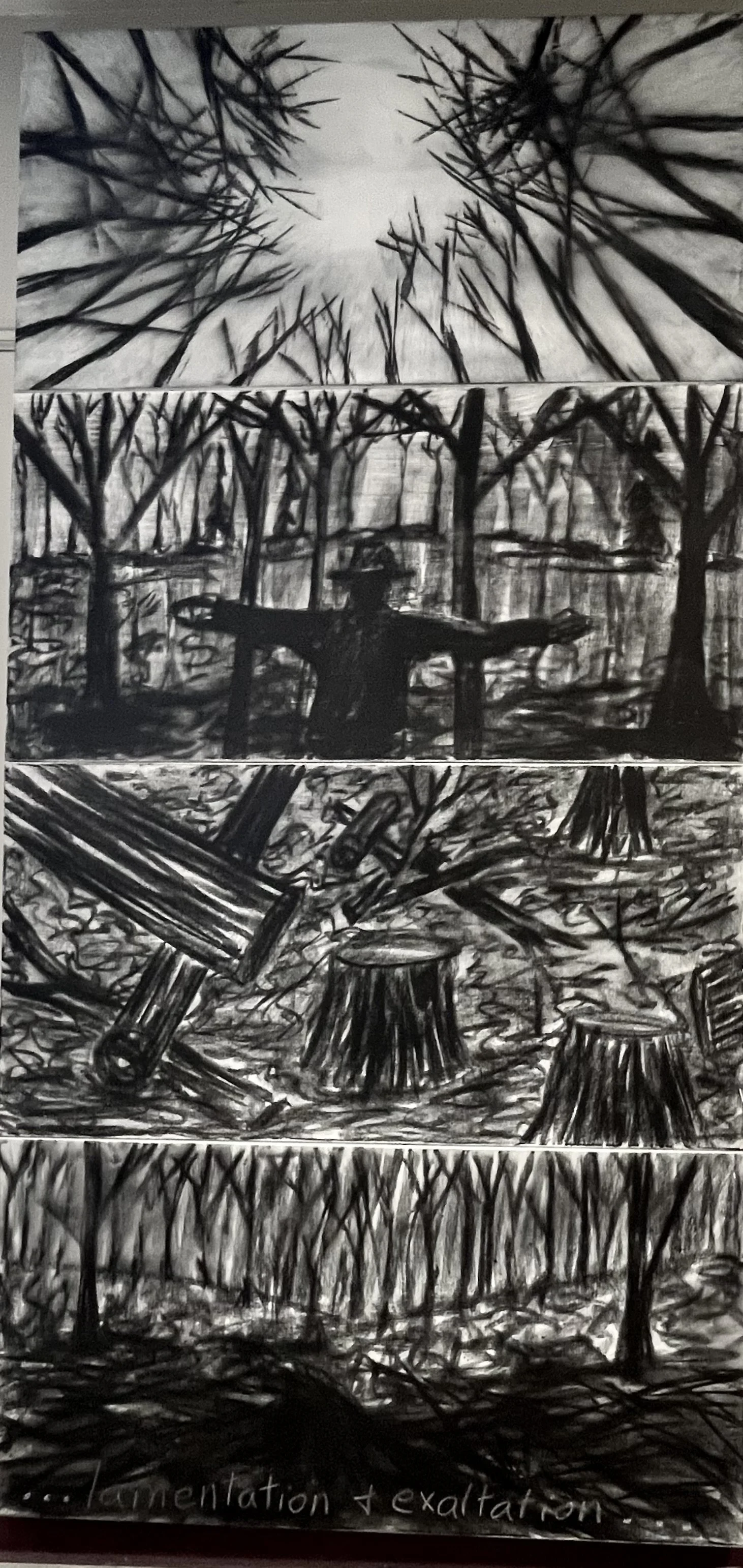 With my first charcoal drawings, I was interested in the beauty of trees and forests. An exhibit of these drawings, “Into the Trees”, can be seen at the Alexander Black House in Blacksburg, VA thru 11/29/25. “Lamentations and Exaltations” runs thru 10/4/25 at Floyd  Center for the Arts in Floyd, VA. These drawings were all done after I encountered a logged forest. As I walked in the remains, I felt that suffering and loss are part of life for trees too, and we share with them a persistent long–suffering resilience, and always the potential of rebirth.