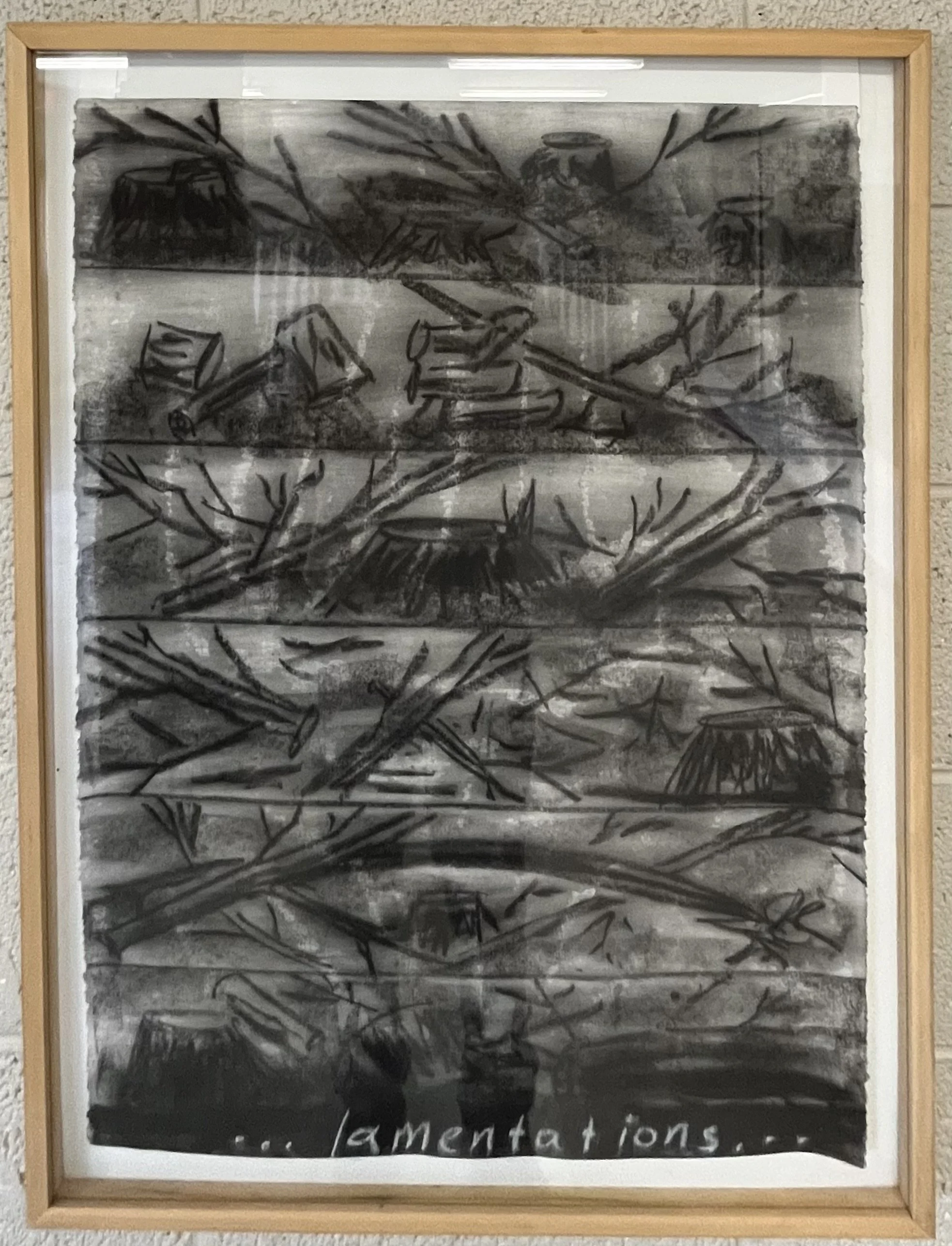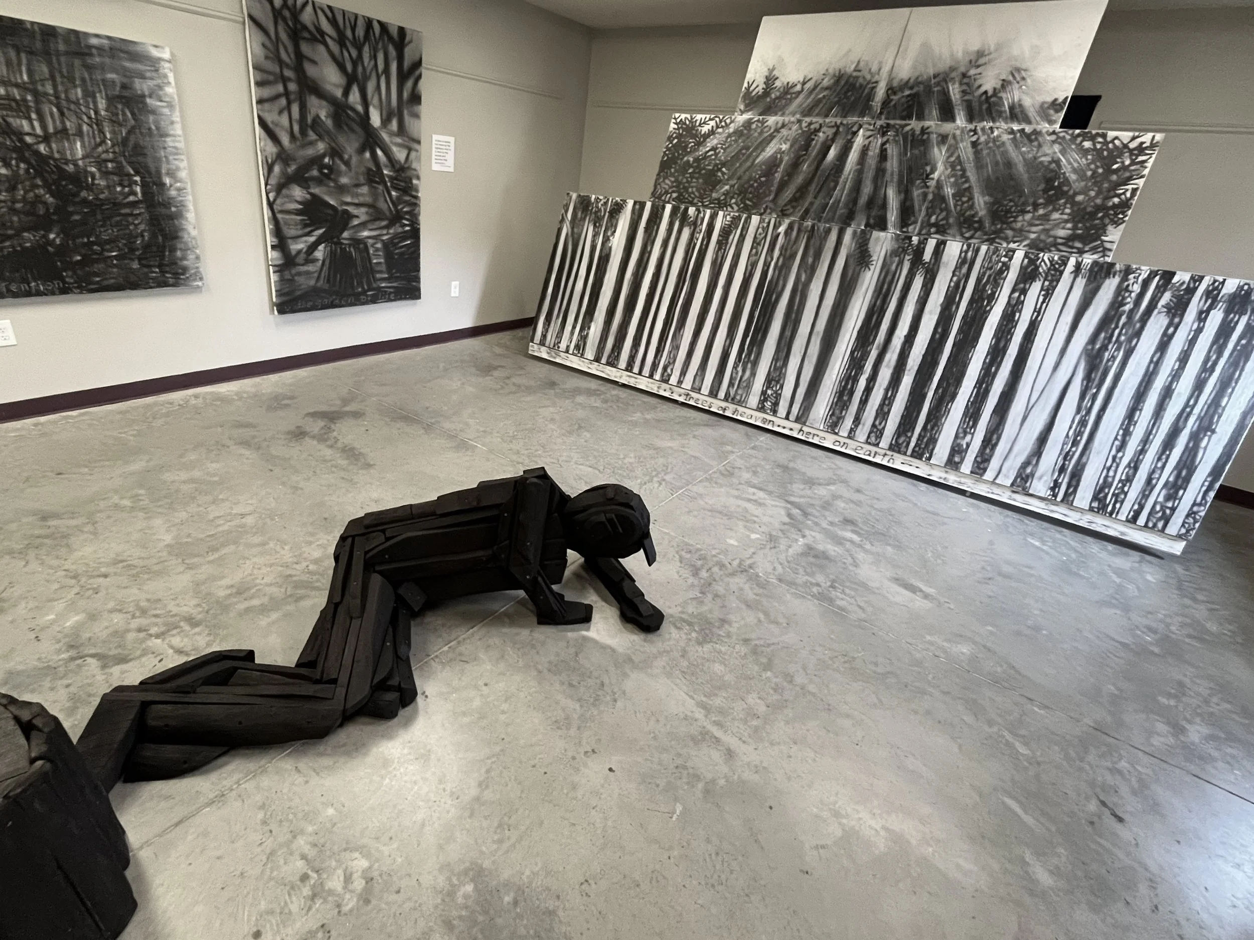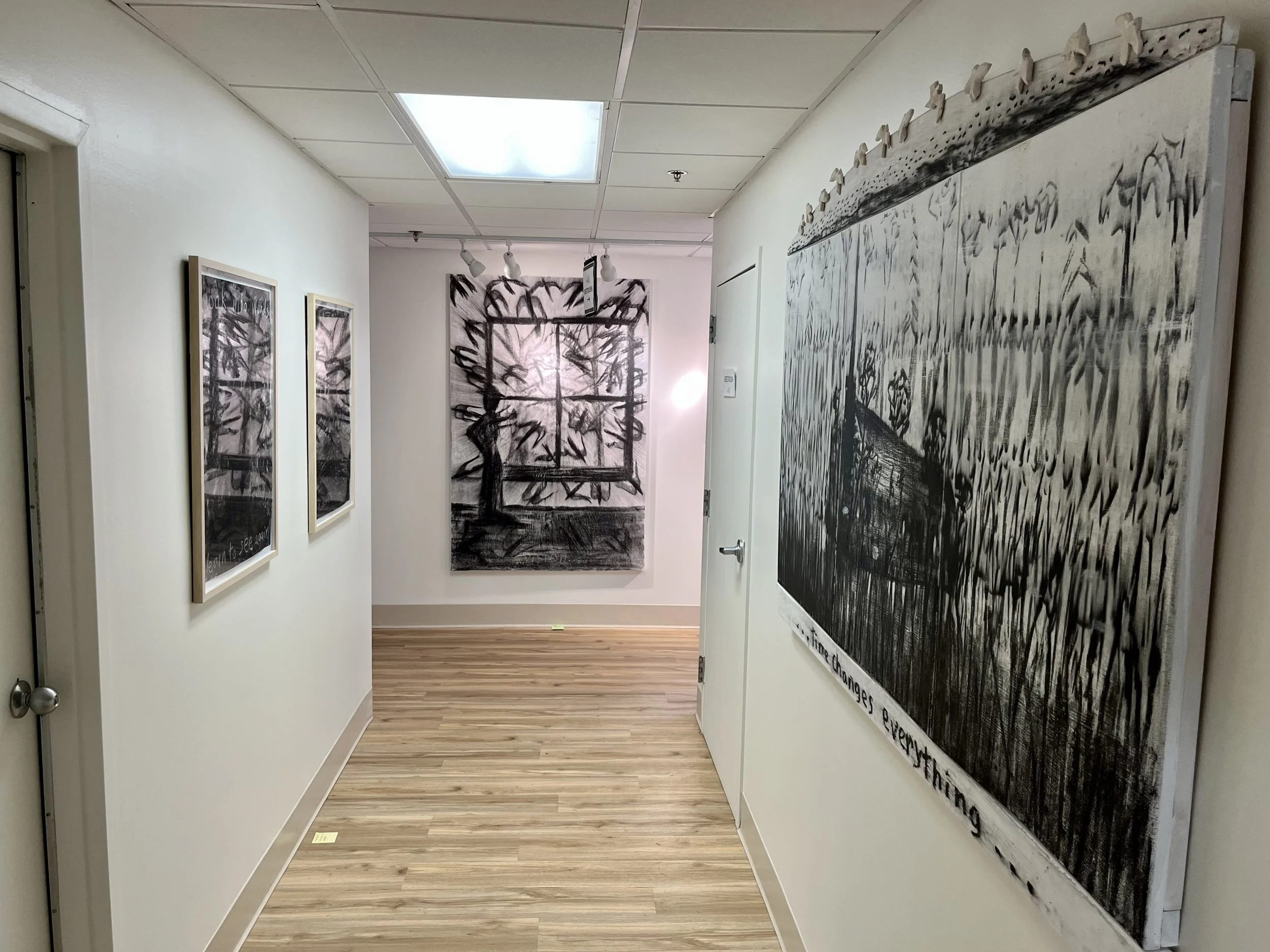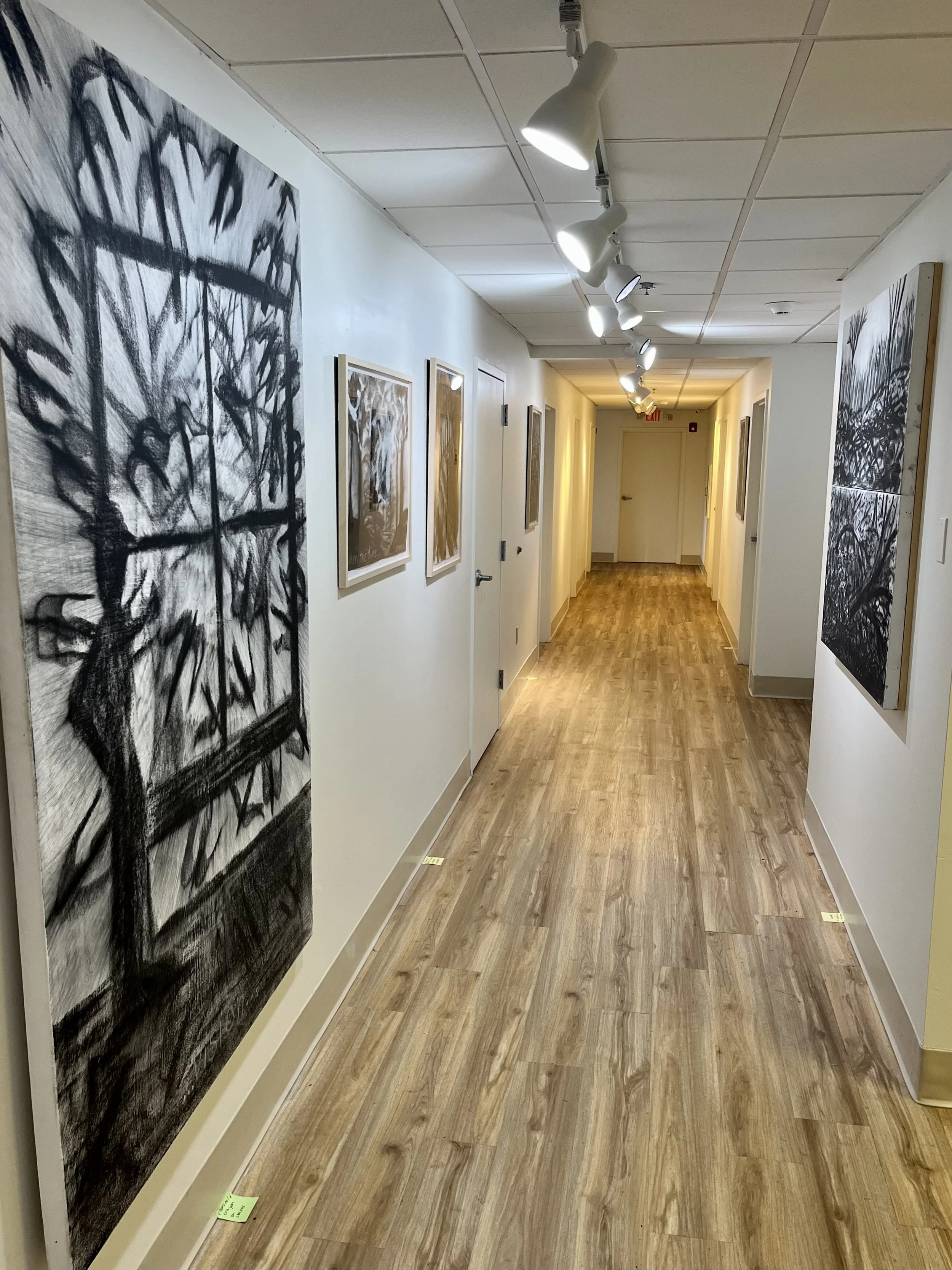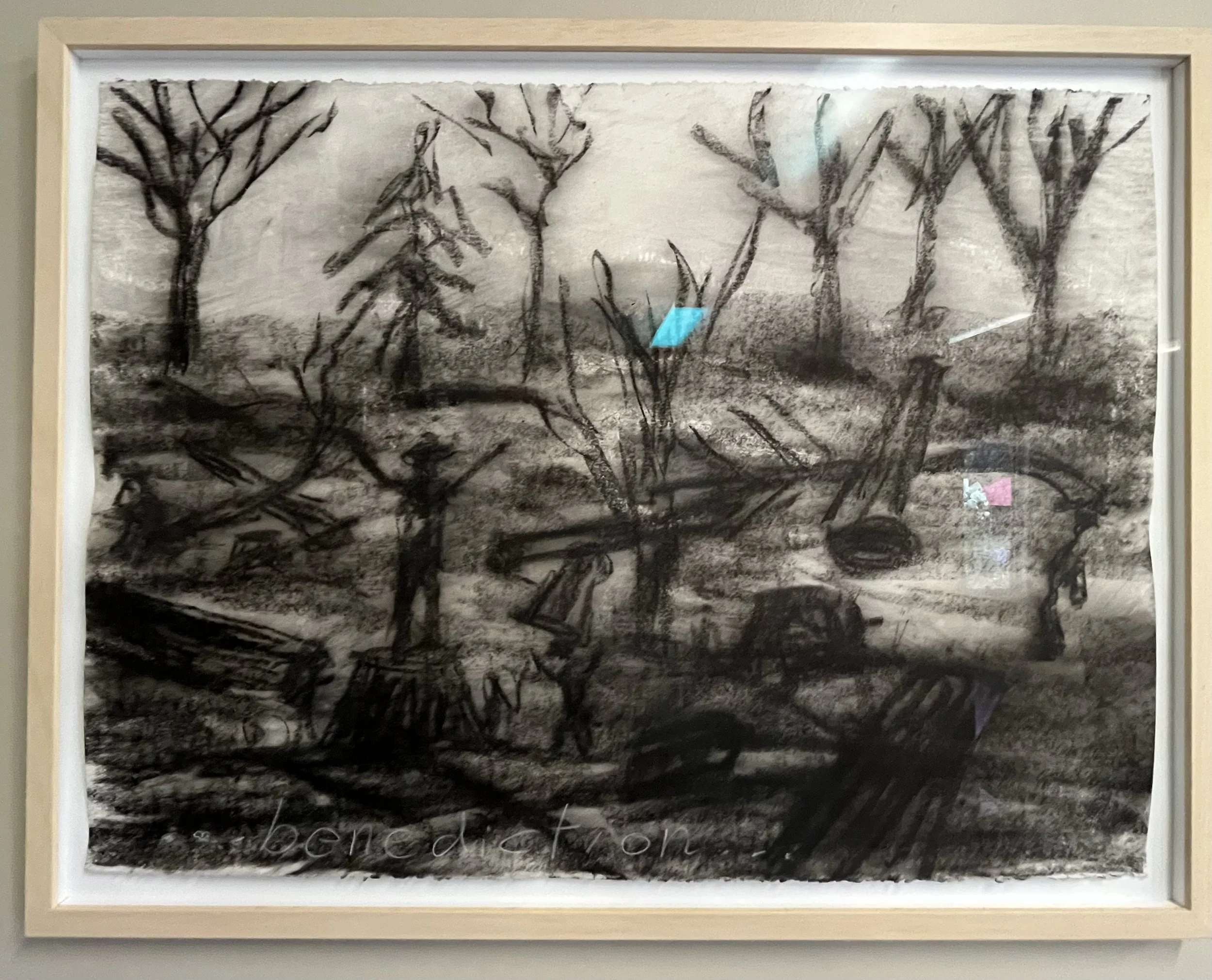 With my first charcoal drawings, I was interested in the beauty of trees and forests. An exhibit of these drawings, “Into the Trees”, can be seen at the Alexander Black House in Blacksburg, VA thru 11/29/25. “Lamentations and Exaltations” runs thru 10/4/25 at Floyd  Center for the Arts in Floyd, VA. These drawings were all done after I encountered a logged forest. As I walked in the remains, I felt that suffering and loss are part of life for trees too, and we share with them a persistent long–suffering resilience, and always the potential of rebirth.