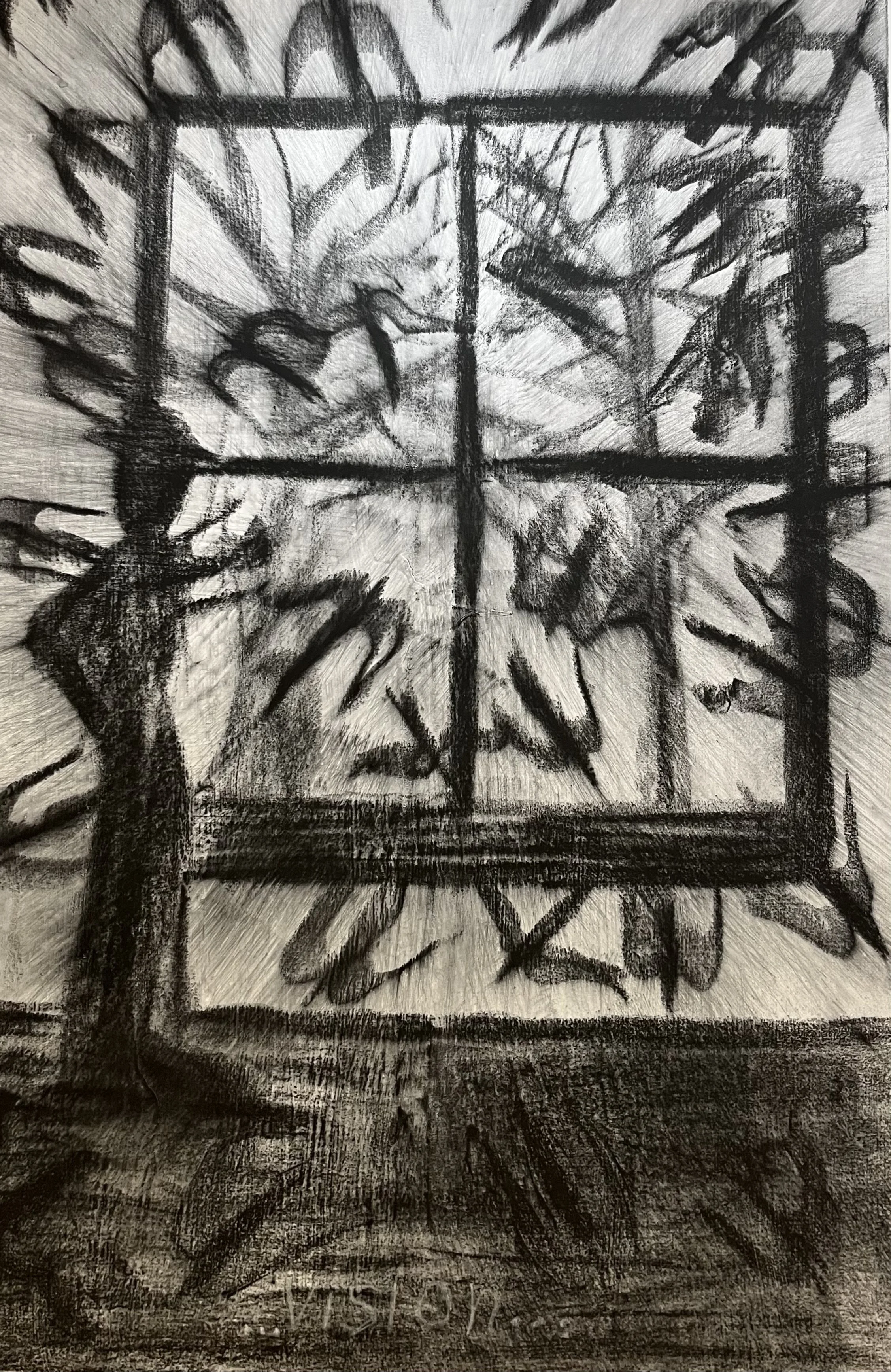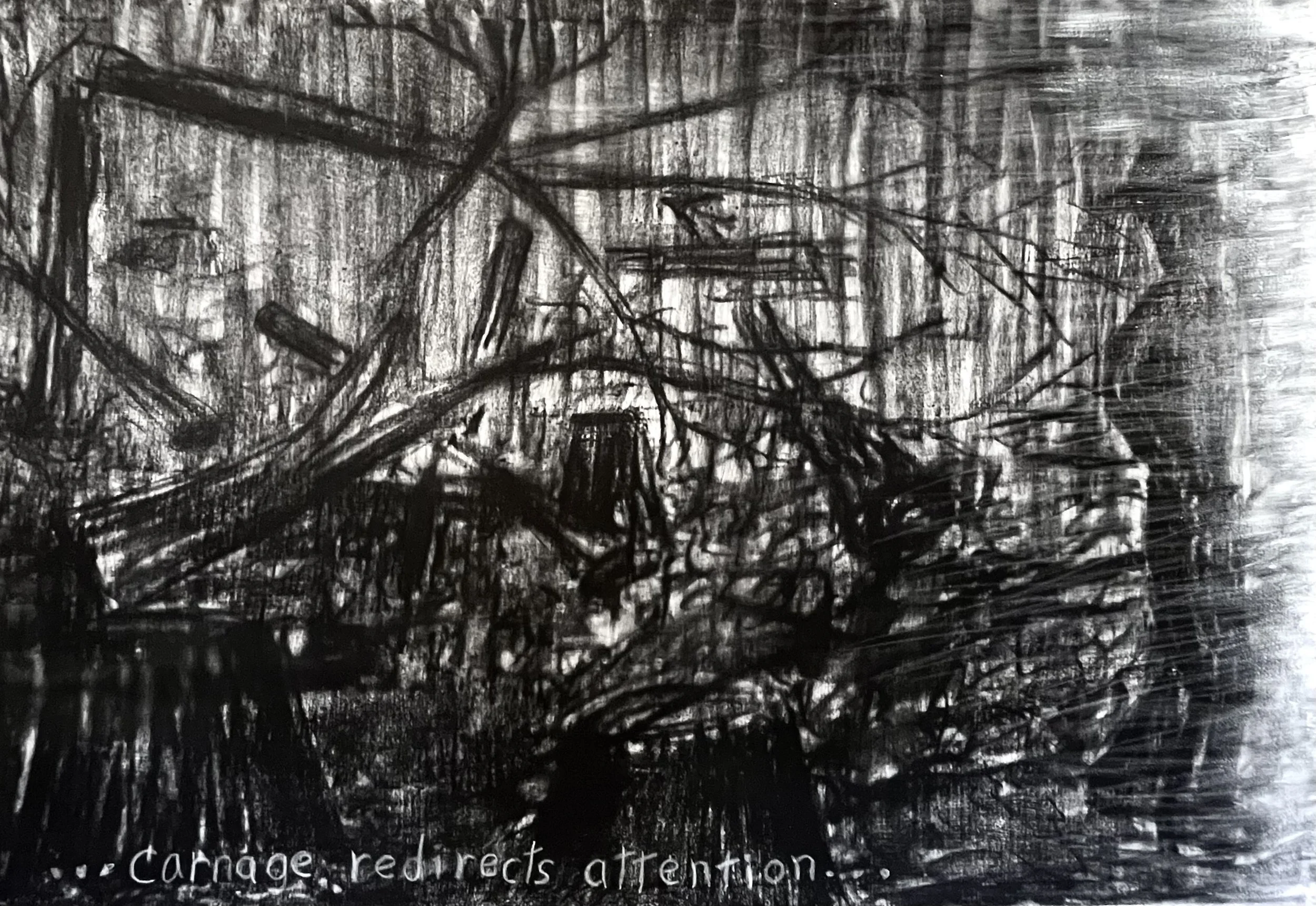 Misting the charcoal with water lets me manipulate it on the surface. It becomes liquid and flows – risking loss of control. By brushing over the surface, I soften edges of lines and forms to resemble my new blurry way of seeing. This in turn suggests to me that perhaps our way of dividing the world into many clear separate things is an illusion, and that everything actually blends into everything else…