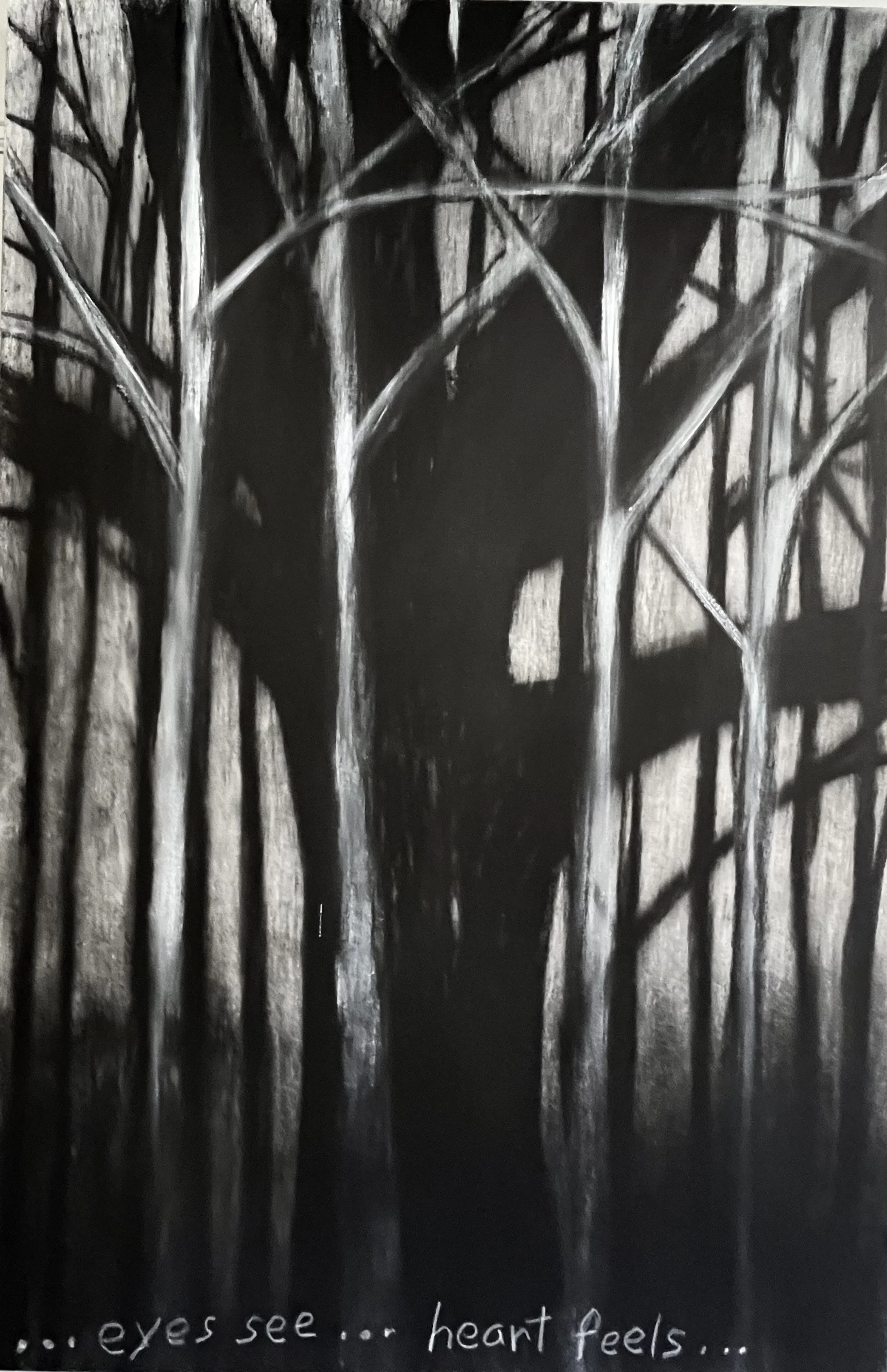 Trees have been good to me all my life. When I suddenly became visually impaired due to RVO (retinal vein occlusion) in both eyes in Fall 2022, the dark silhouettes of trees against grey skies were something I could still see. Their dignity, strength, and grace inspired me, and I began drawing them. Compressed charcoal sticks on white paper or canvas create high contrast marks that I can see.